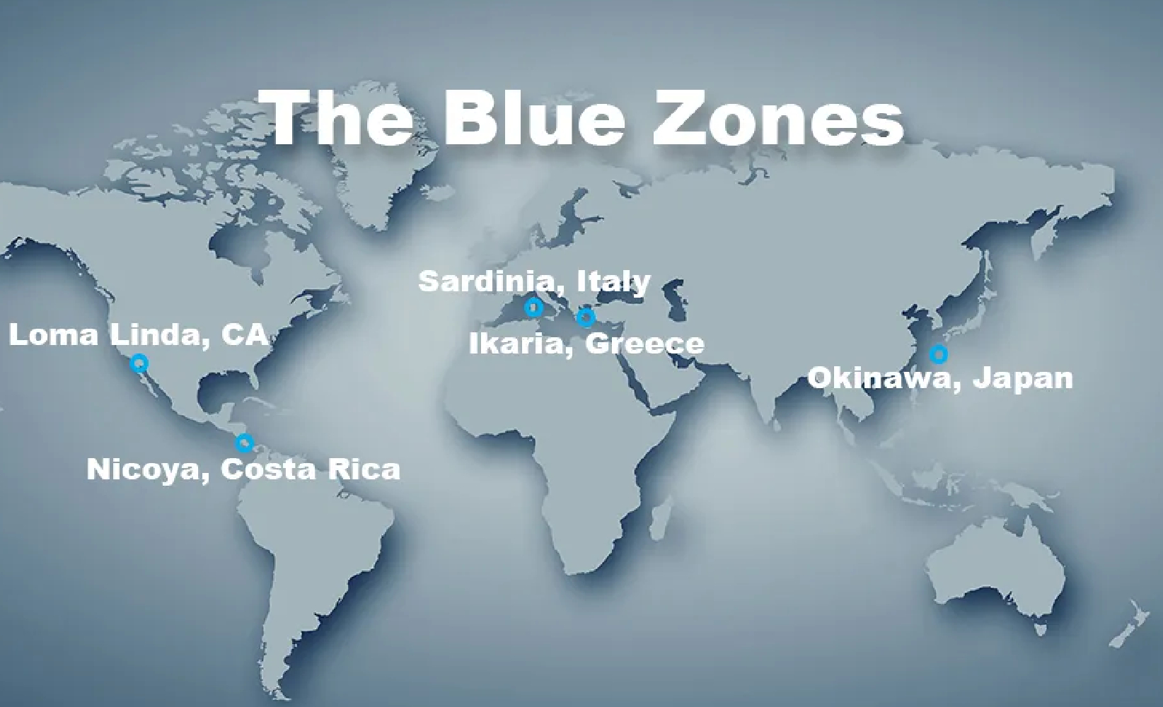 ( أرخبيل أوكيناوا في اليابان؛ سردينيا في إيطاليا؛ شبه جزيرة نيكويا في كوستاريكا؛ إيكاريا في اليونان؛ ولوما ليندا في كاليفورنيا).