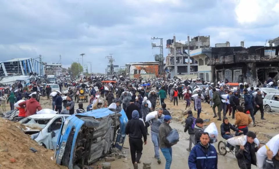 فلسطينيون يحملون أكياس الطحين التي حصلوا عليها من شاحنة مساعدات بالقرب من نقطة تفتيش إسرائيلية، حيث يواجه سكان غزة مستويات أزمة الجوع، وسط الصراع المستمر
