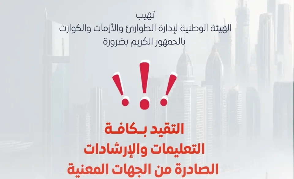 أهابت الهيئة الوطنية لإدارة الطوارئ والأزمات والكوارث، بدولة الإمارات العربية المتحدة، بالمواطنين والمقيمين، ضرورة التقيد بكافة الإرشادات والتعليمات الصادرة من الجهات المعنية، حفاظاً على سلامة الأرواح والممتلكات، خلال الحالة الجوية غير المستقرة التي تشهدها البلاد، اليوم الخميس مايو 2024.