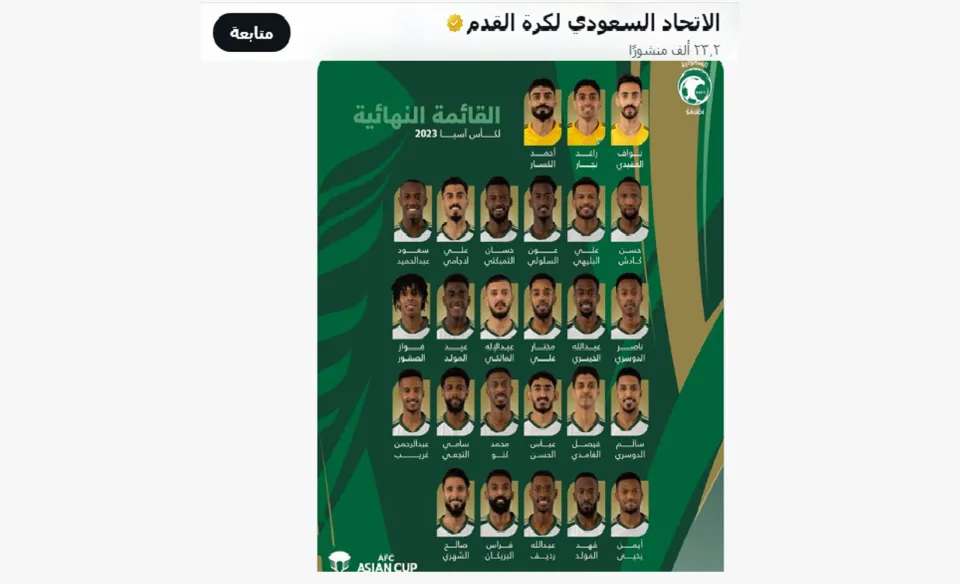 وأعلن حساب المنتخب السعودي على منصة «إكس» للتواصل الاجتماعي، تشكيلة نهائية ضمت 26 لاعباً.